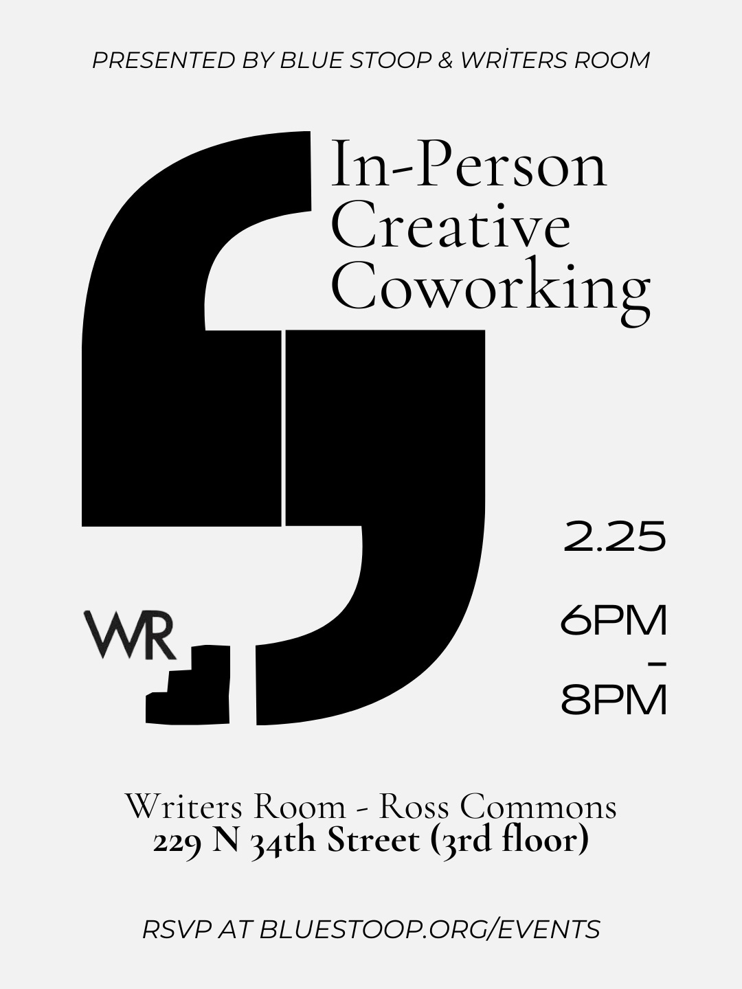 In other news, Blue Stoop is hosting an in-person Sit & Write (a.k.a. Creative Coworking session) at the Drexel Writers Room next Wednesday evening. We’d love to see you there.